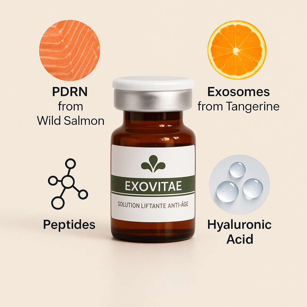 Die Exovitae-Ampulle kombiniert Tangerine-Exosomen, PDRN, Peptide und Hyaluronsäure – für Regeneration und sichtbar glattere Haut.